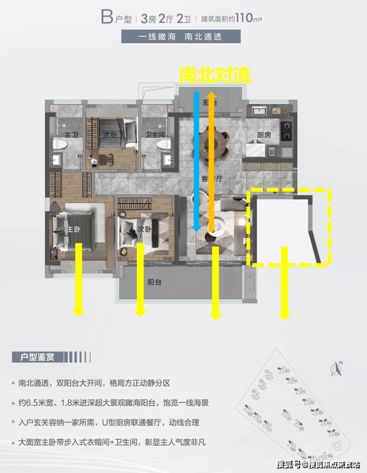 110平的户型,延续了92平的设计亮点,长阳台+南北对流+四开间朝南,通风采光一流。