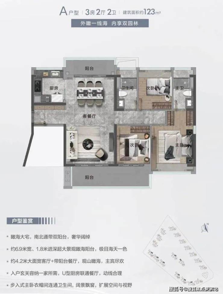 在售最小的79平户型在8号和9号楼,朝南向主要看小区园林,高层可以部分看海,三开间朝南。