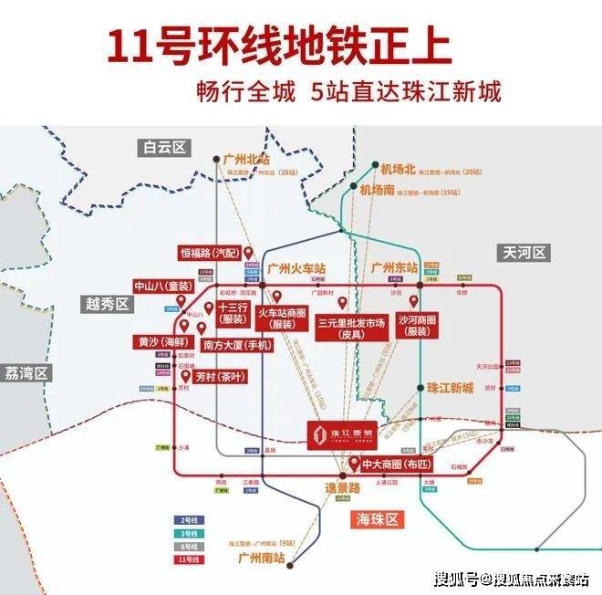广州首条环线地铁11号线逸景路站正上,负一层与地铁站联通,连接天河、越秀、荔湾、白云和海珠中心五区,串联广州十大专业市场,5站直达珠江新城,预计2022年底通车,届时珠江壹號业主将畅享便捷出行。