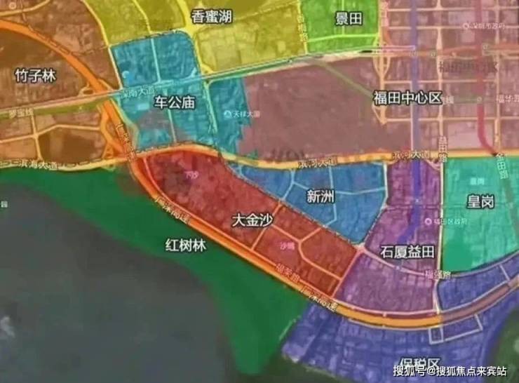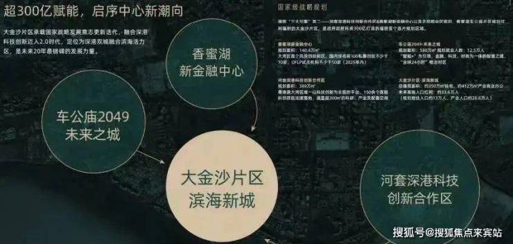 【政策倾斜 见未来】超300亿大金沙规划唯一接驳福田CBD和深圳湾的滨海新城,北邻香蜜湖新金融中心和车公庙2049未来之城,南接河套深港科创合作区,以政府资源的倾斜和前瞻的规划,成为最具生长力片区,主推福田CAZ转型。