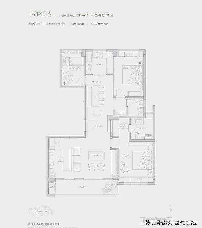145产品为三房两厅两卫产品,餐厨一体化设计, 7米宽厅可切换各种生活场景,畅享宽幕般景观界面。
