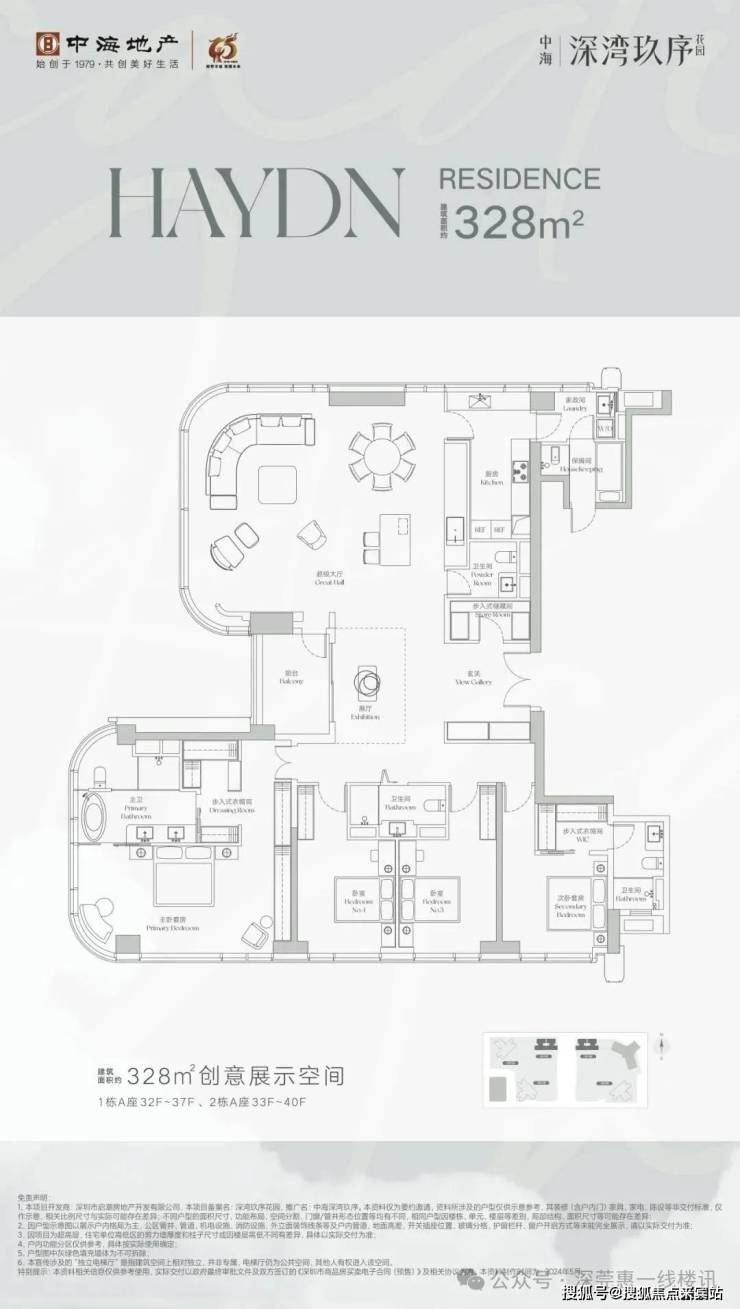 328平4房+1灵动空间+4卫,配置非常高:不仅有3梯2户的超高配置,而且4居室均南向排布,能够充分享受到充沛阳光;2个纯套房+2个类套房,能够享受到更周到的生活体验;中西厨设计,独立的保姆间设计;共138套。
