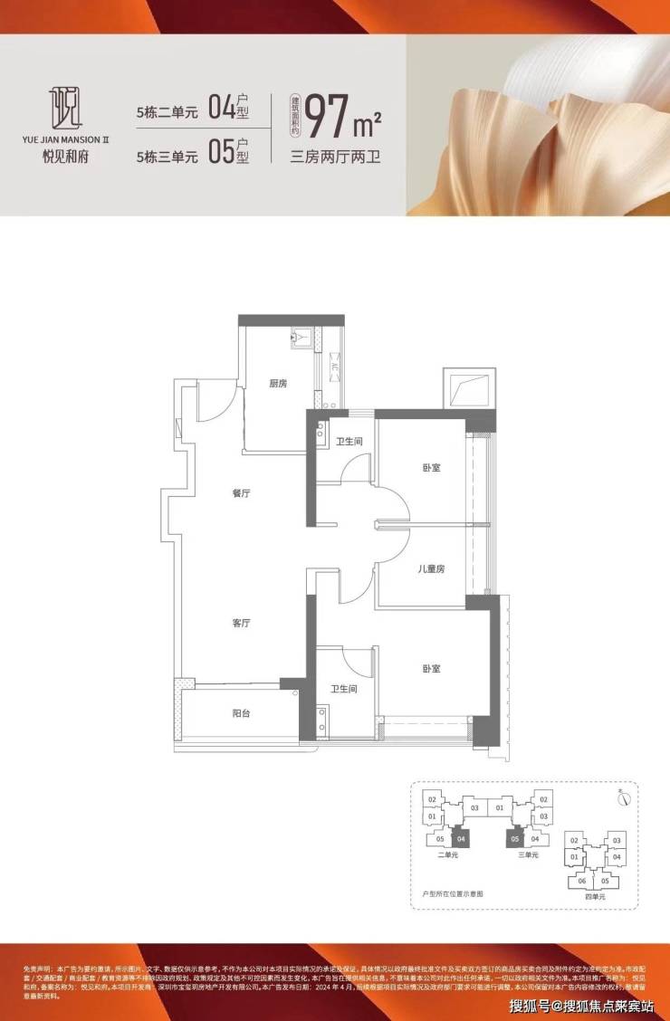 户型面积布局04/0597平三房两厅两卫设计的是竖厅格局,进门独立玄关,LDKB一体化设计,客厅3.5米开间,动静分区,S墙设计预留了冰箱卡槽位,U型厨房,公卫三段式分离设计,得房率:72.73%(不含赠送),阳台都是西南朝向。