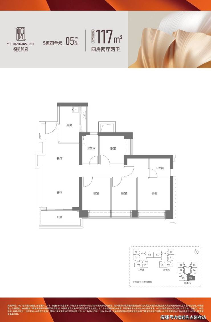 户型面积布局05117平四房两厅两卫设计的是经典竖厅格局,进门独立玄关,LDKB一体化设计,客厅3.7米开间,动静分区,四开间朝南,S墙设计预留了冰箱卡槽位,U型厨房,得房率:73.9%(不含赠送),阳台有朝西北或东南朝向。