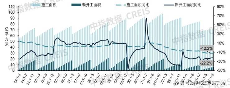 图:2014年至今全国房屋累计新开工和施工面积及其同比增速