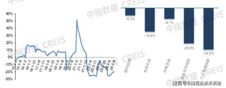 图:2015年至今全国房企到位资金同比增速及2024年1-9月各项资金来源同比增速对比