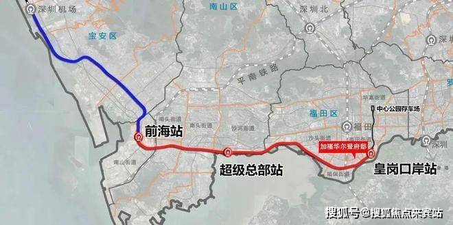 轨道:穗莞深城际轨道2站直达前海,联通两大深港合作区;穗莞深城际(建设中)延长线——穗莞深城际前海至皇岗口岸段设有皇岗口岸站,途径南山、福田等地,建成通车后2站到前海,1站到深圳湾总部基地。