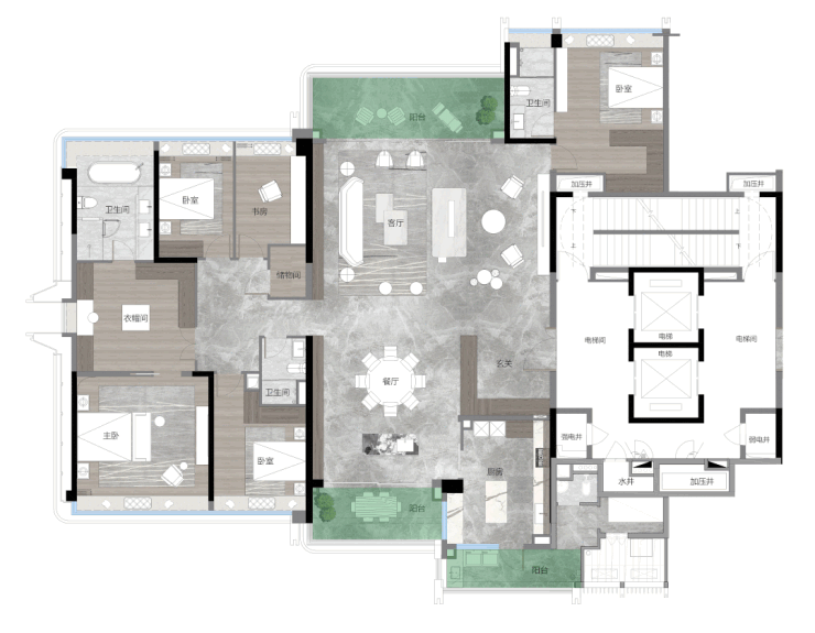 部分户型罕见的三阳台设计,家政阳台与独立家政空间连接,更流畅的家政动线,恰到好处地满足圈层人物私密与高效并重的居住哲学。