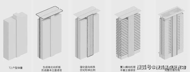 以“轻、薄、平”为核心,通过南北向折板设计将建筑最大化的进行视觉压缩,创造出扁平的轻薄感;同时在立面横向线条的拉伸下,赋予建筑超平整的视觉享受。
