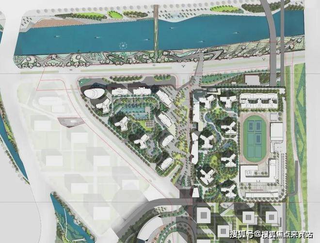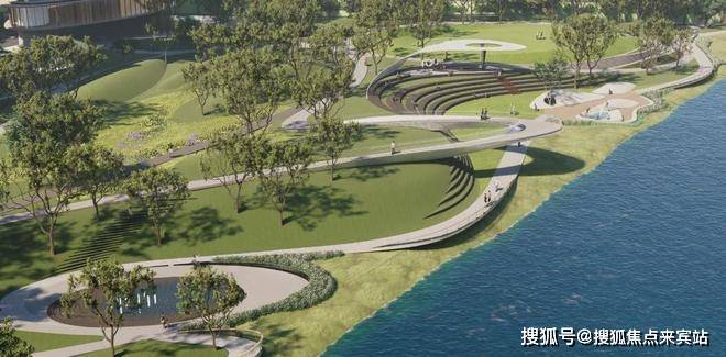 滨河公园以“都市山谷,隐秘的繁盛”为主题,将建筑融入自然水岸间,赋予琶洲南TOD更多的慢行空间。