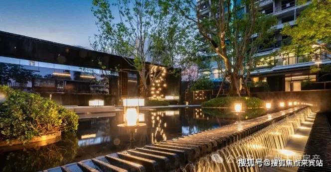 夜幕降临时,富有层次感的氛围灯,零星点缀,映照在潺潺跌水、安哥拉黑石台上,又给人一种高贵又内敛的感觉。