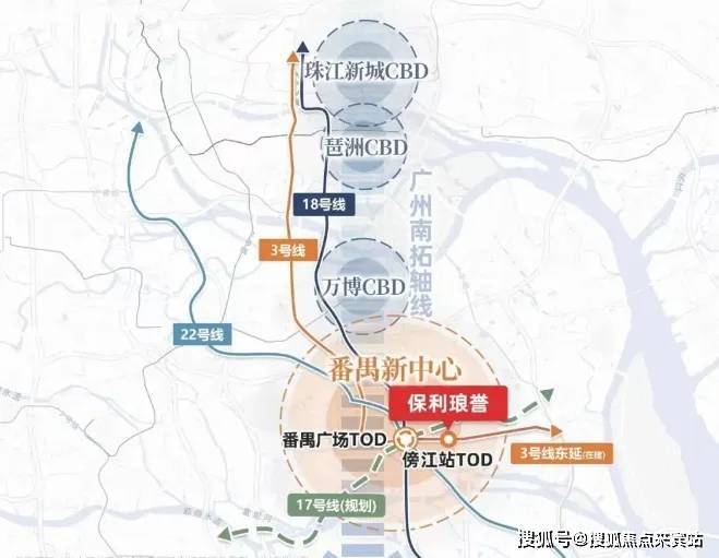 一站即达番禺广场站,里面有地铁3号线、18号线、22号线、3号线东延段(在建中) 、17号线(规划中)五轨交汇,一站畅行琶洲,两站通勤珠江新城