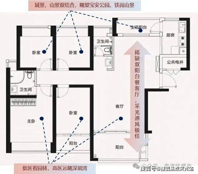 三阳台:前海黄金圈内,唯一在售89㎡三房两卫三阳台,客厅阳台进深2米,堪比140㎡大户型阳台