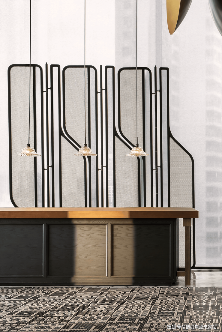 接待大堂的古典又现代的柱廊,造型简洁的天花呈现立体阵列状,无明显的中式符号,却显现出东方的庄重大气。地面法式的鱼骨纹拼接木地板,强化了空间视觉上的延伸感。吊灯、地面拼花、屏风及装饰画等元素的巧妙搭配,增添了空间的艺术气息,散发着独特的中法整合魅力。