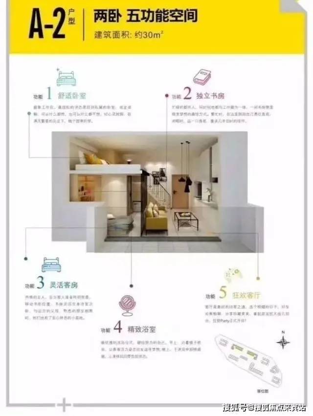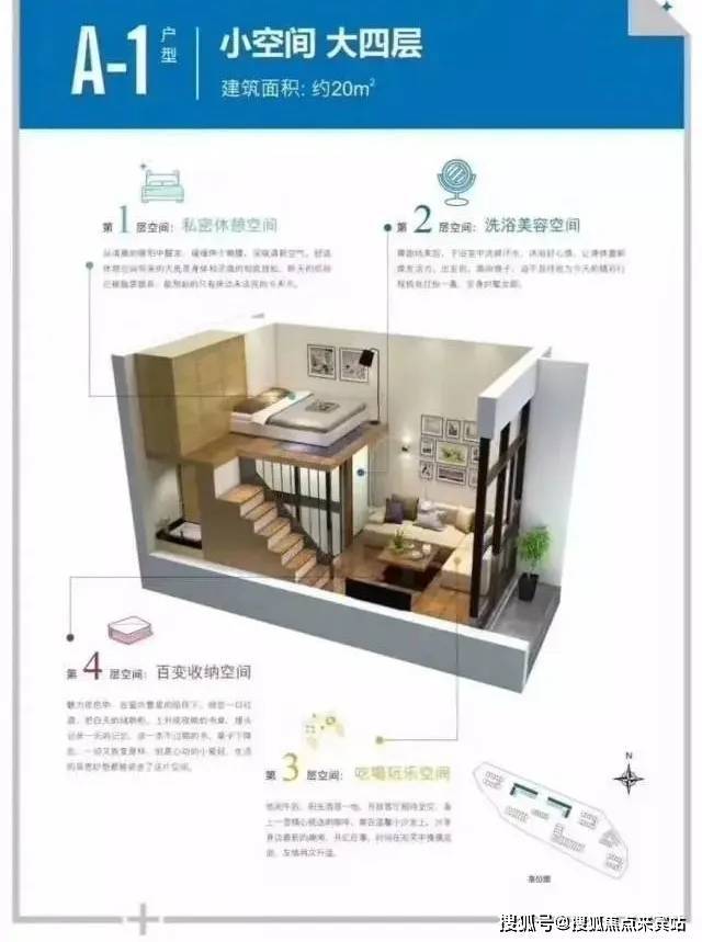 A-1户型品鉴:3.6米层高,单面采光,上下分层布局合理,收纳、起居、空间相对独立。较高的采光高度,足以满足室内自然光线的明亮,小阳台也可完全满足日常外界接触空间和晾晒的需求。