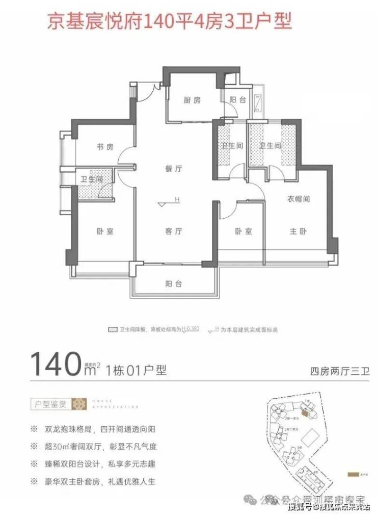 住宅:主力户型为110-143㎡三至四房,精装交付,部分户型双阳台设计,南北通透,预计2026年4月交付。