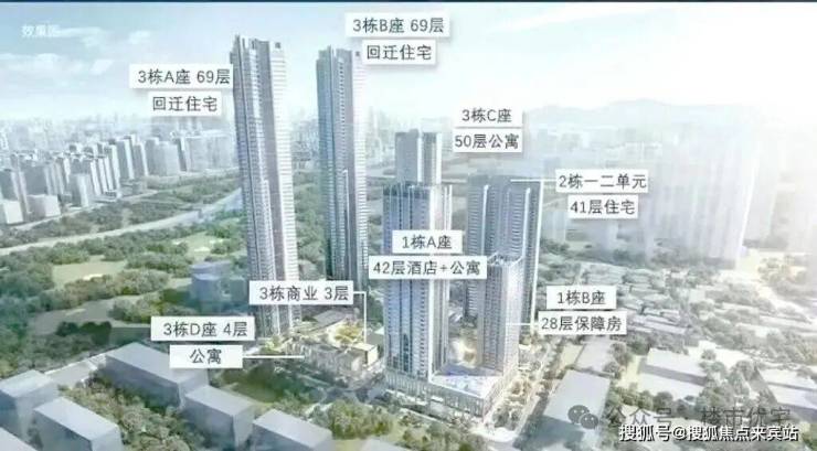 整个项目分两期开发建设,其中:项目一期东地块包含1栋酒店+商务公寓、1栋保障房、2栋包含一、二单元的住宅;西地块包含2栋高约250米的超高层住宅,另有1栋约50层高的商务公寓。