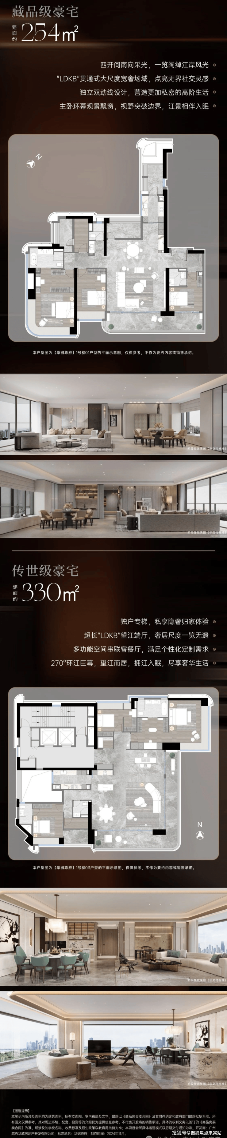 户型设计:项目主打 248 - 330㎡的天际大平层,仅 96 席,每一席都极为稀缺。以部分户型为例: