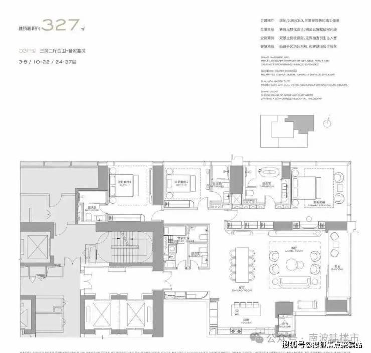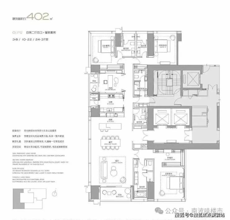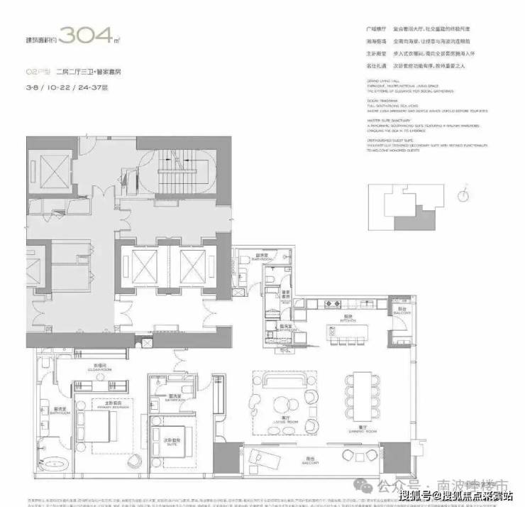 建筑面积约303–327–402—568-1032㎡大平层,主力户型2-4房,单价11-22万,3个样板房吸引不同层级高端居住与投资需求。
