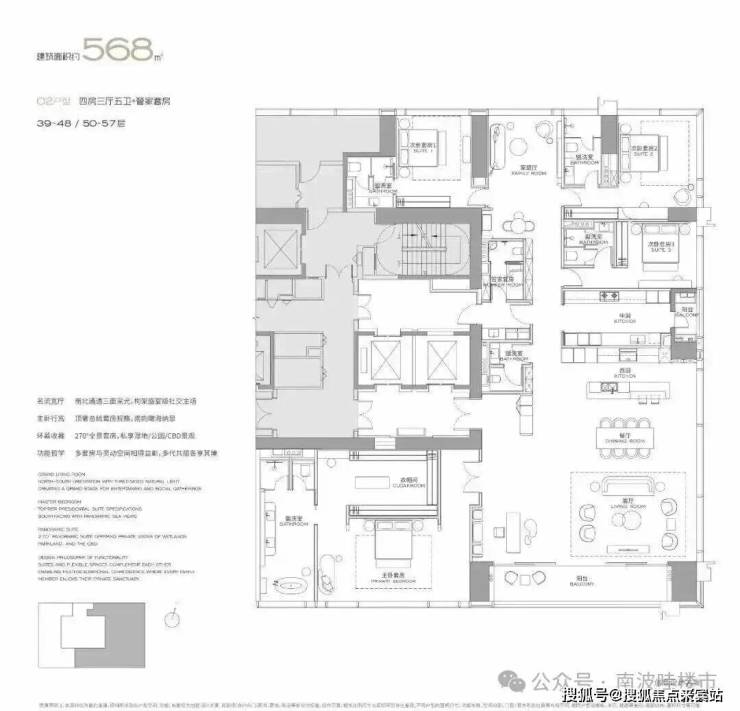 南北通透三面采光,顶奢总统套房规格,270°全景套房,享受湿地/公园/CBD景观,都是套房设计,更具私密性,中西厨分离。