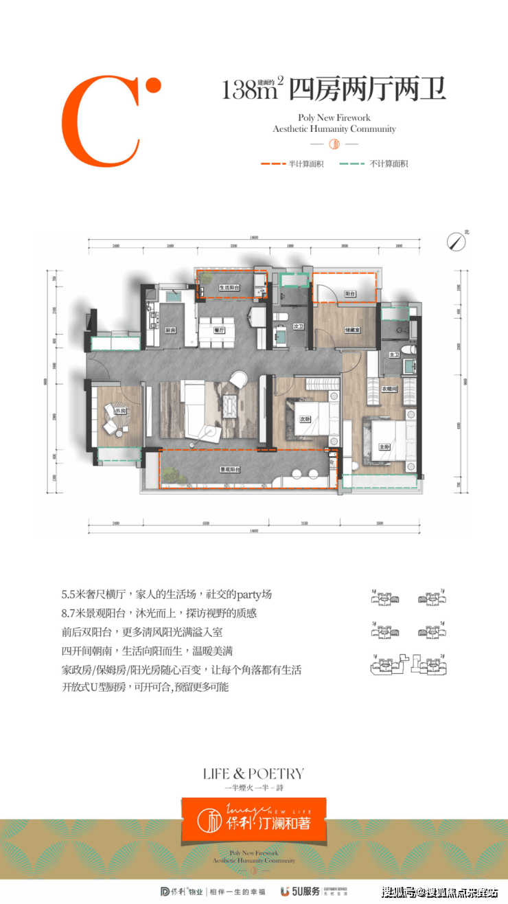 项目提供建面约109㎡三房两厅两卫、120㎡和138㎡四房两厅两卫,三个面积段可以对位不同购房群体。