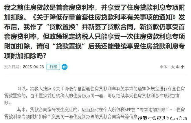 近日,在国家税务总局12366纳税服务平台官网上,国家税务总局在回复提问时表示,纳税人按照《关于降低存量首套住房贷款利率有关事项的通知》规定进行存量住房贷款置换的,由于置换前后纳税人的住房仍为同一套,可以继续享受住房贷款利息专项附加扣除。