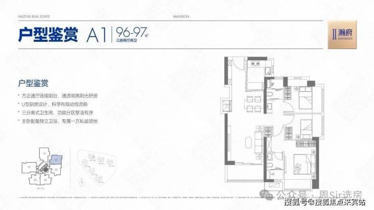 96-97㎡的3房2厅2卫,A1户型/2栋2单元02,设计的是竖厅格局,客厅3.5米开间,LDKB一体化,S墙设计预留冰箱卡槽位,动静分区,三开间朝南,双次卧东北向,得房率约78%(不含赠送),U型厨房,公卫三段式分离,东南朝向。