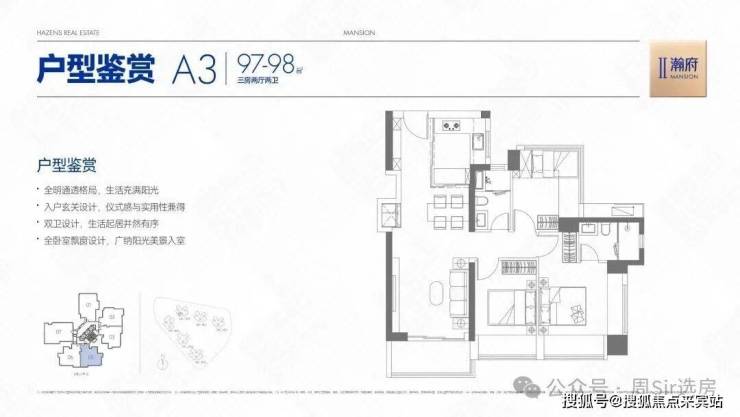 97-98㎡的3房2厅2卫,A3户型/2栋2单元05,设计的是经典竖厅格局,客厅3.5米开间,LDKB一体化,S墙设计预留冰箱卡槽位,动静分区,三开间朝南,主卧+1个次卧双飘窗,得房率约78%(不含赠送),U型厨房,卫生间干湿分离,西南朝向。