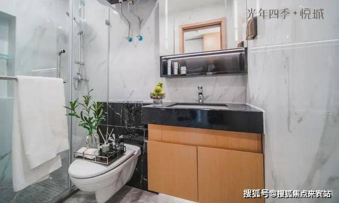干湿分离的卫生间尺度,也比同类产品要大,且水龙头、花洒、马桶用的是TOTO (或同品牌),镜柜也是卡诺亚(或同品牌)。