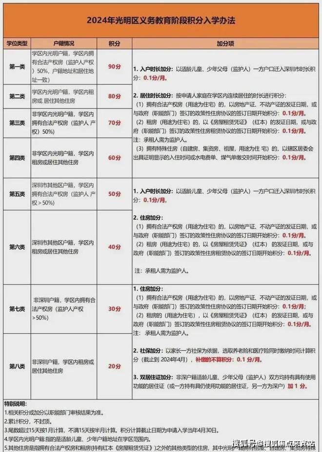 目前光明区义务教育阶段学位类型按照适龄儿童、少年户籍和家庭购房情况分为八类,积分项目及标准如下: