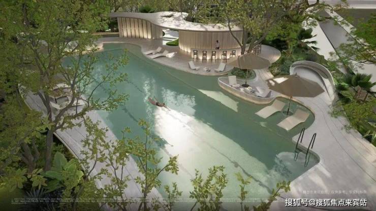 在垂直的山林溪谷间,匠造一方悬浮林下的度假泳池,环水设有观景吧台、岸边日光躺椅、艺术沙发等多重复合体验,营造城市中心难得的森境疗愈度假感。