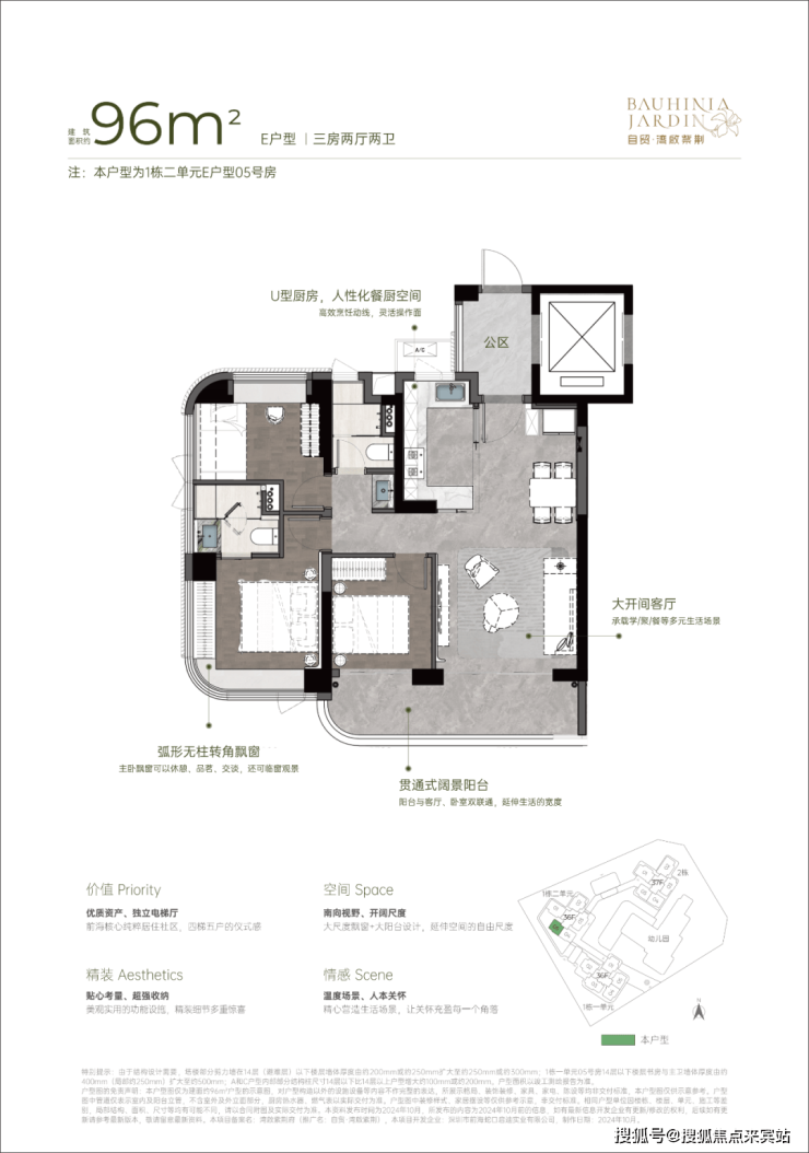 96m²三房两厅两卫的E户型: