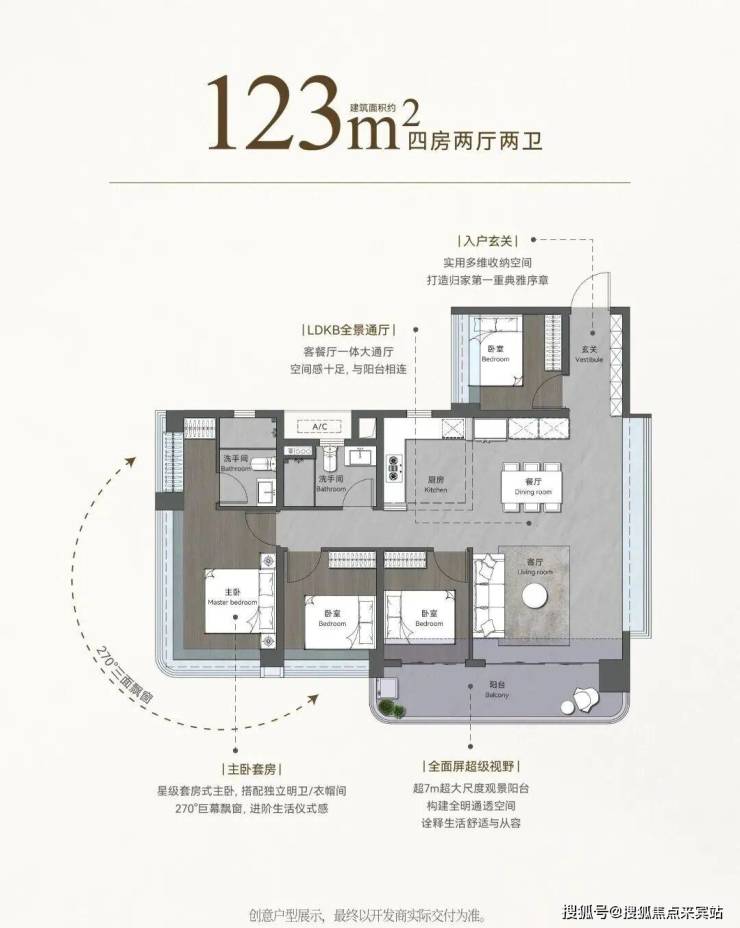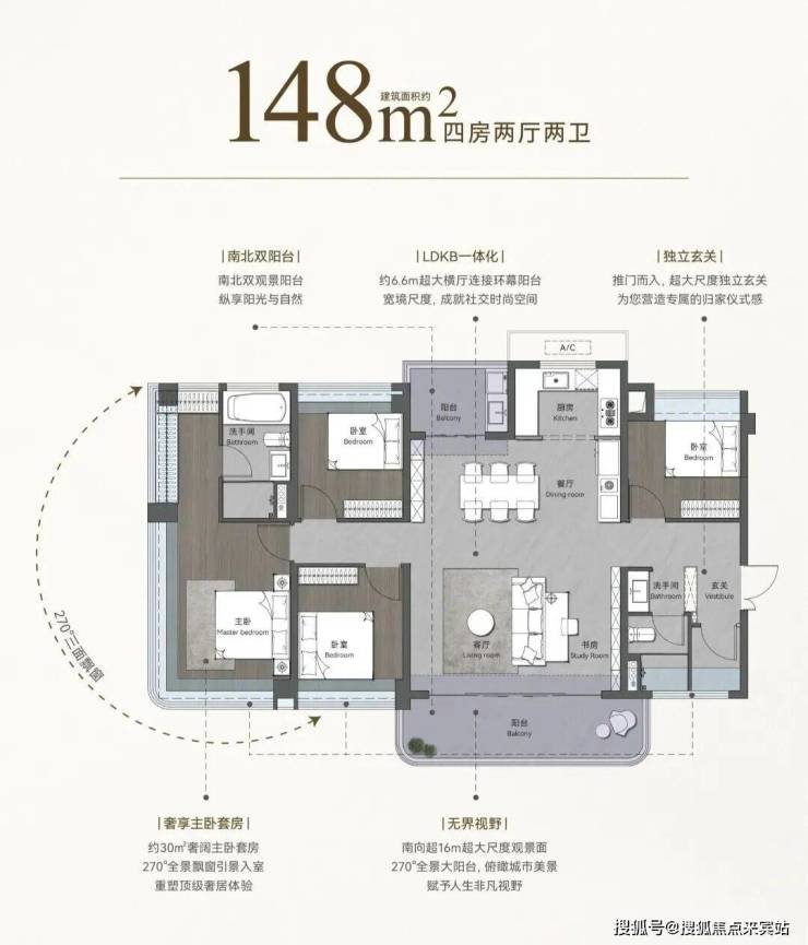 朝向:西南向16m超大尺度观景阳台,6.6m270°观景阳台,约30㎡超大主卧,270°全景飘窗