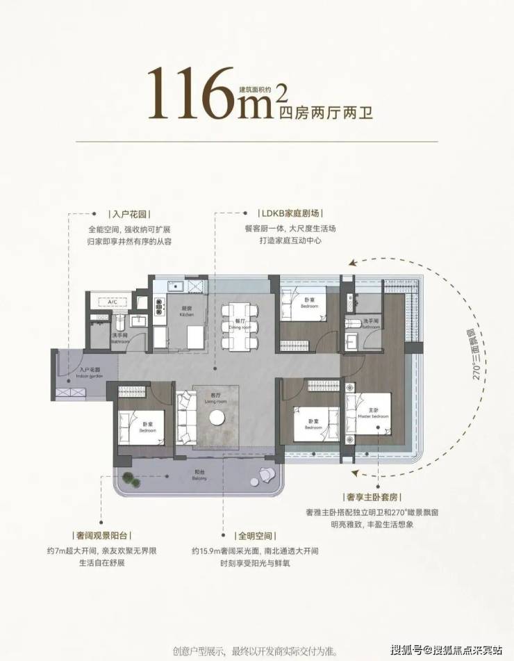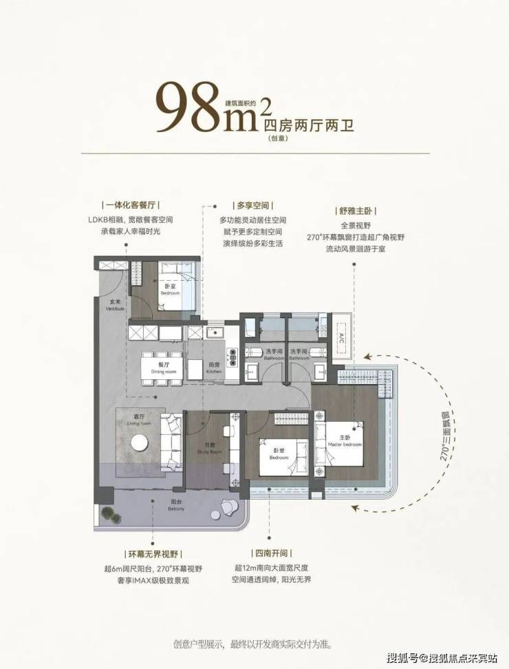 LDKB一体化设计,超6米宽阔阳台,四开间朝南,270°环幕视野。