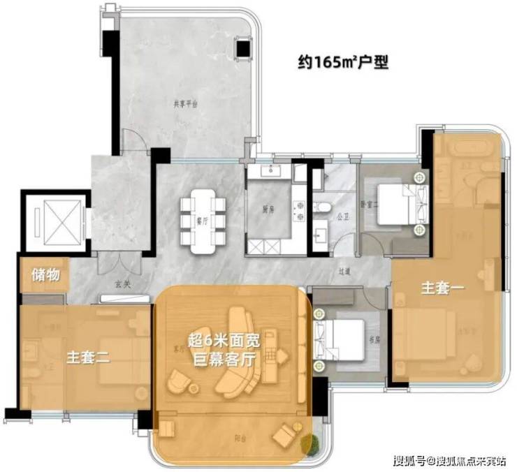 120㎡户型:珠江新城首个同尺度下做到四房两卫的创新型产品,约6.7m的双面宽阳台连通客厅和次卧;主套设置了专属衣帽间,与卫浴空间隔墙分开。
