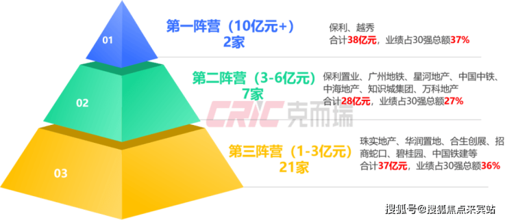 TOP30 “金字塔式”分化,除了双雄领跑,第二梯队的竞争同样精彩,TOP10房企里面有7家房企排名同比上升,保利置业、中国中铁、知识城集团排名上升亮眼。其中,保利置业排名大幅上升16位跃居权益榜第三,销售金额同比增加3.09亿元,增长最为显著,近六成业绩来自荔湾白鹅潭广州·保利翡丽甲第;广州地铁地产依托TOD开发优势以5.02亿元位列第四;其它房企销售金额集中在3亿—4亿元,业绩差距较小。