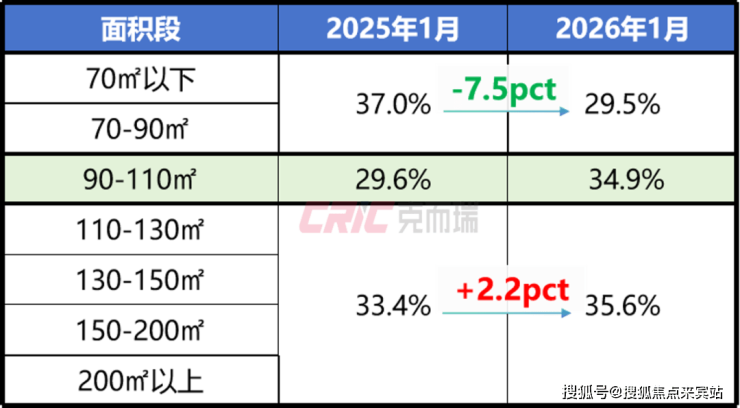 主流产品未发生根本性变化,但有一个现象值得关注,以主流产品90-110㎡为界,90㎡以下、110㎡以上占比呈现两极分化:90㎡以下刚需产品占比份额在缩小,同比减少7.5个百分点,占比不足三成;110㎡以上的市场份额在扩大,同比增加2.2个百分点,总占比35.6%反超90㎡以下刚需产品,成为市场新的支撑点。