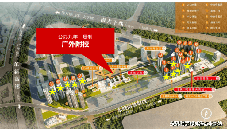 作为项目王牌卖点,配建公办九年一贯制广外附校(已开学),设置45个班,依托广东外语外贸大学教育集团资源,师资力量雄厚。参考广外番禺外校成绩,2021年中考20%学生总分超700分,远超广州平均水平。社区内星瀚幼儿园(已开园)形成“幼儿园+小学+初中”的一站式教育链,书香氤氲中铺就菁英成才之路,精准解决刚需家庭的教育痛点。