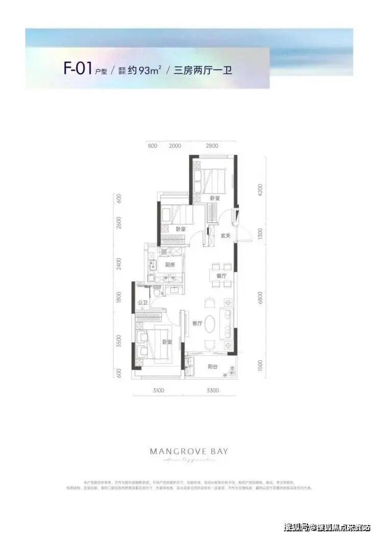 A02户型76平2房2厅1卫:房间和客厅朝南向,采光充足;约5.8米开阔观景阳台,俯瞰红树林自然生态;动静干湿自然分离,生活有序互不干扰。F01户型93平3房2厅1卫:客厅、餐厅连通阳台,自然采光充足;宽景竖厅,空间开阔;主卧独立卫生间,隐私雅奢生活;动静干湿分离。G01户型112平3房2厅2卫:同样拥有客厅、餐厅连通阳台的设计,自然采光充足;全屋飘窗,尽享超大采光面;主卧独立卫生间;动静干湿分离。C03户型134平4房2厅2卫:方正紧凑格局,合理精研每一寸空间;独立私家书房;约6.6米宽阔景观阳台;客厅、餐厅连通阳台;主卧飘窗。