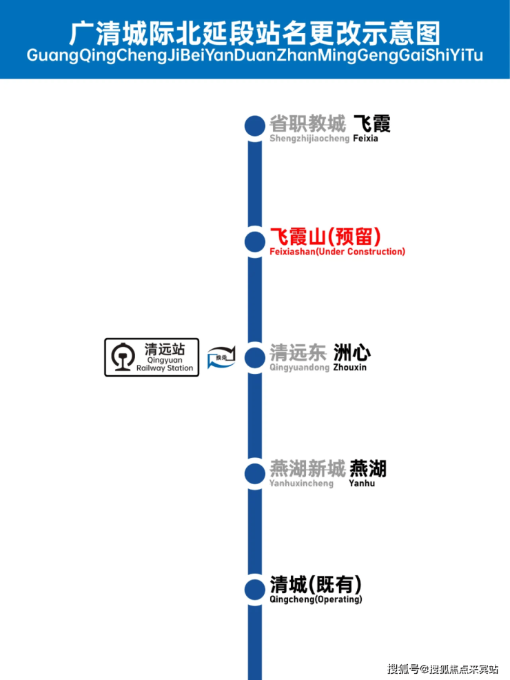广清城际北延线起于广清城际清城站,终于飞霞站(原省职教城站),正线全长19.737公里,设计时速200公里,全线设燕湖站(原燕湖新城站)、洲心站(原清远东站)、飞霞山站(预留)、飞霞站(原省职教城站),共计4座车站。计划今年底开通运营。