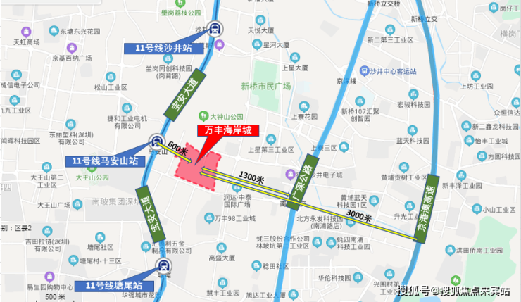 项目距离11号线马安山站直线距离约600米左右,距离项目最近的地方只有300米左右,目前11号线可与深圳地铁1号、2号、3号、5号、6号、7号、9号、12号这8条线路直接换乘。道路交通方面,项目附近有两条主干道,距离宝安大道直线距离约600米左右,距离广深公路约1.3公里左右,这两条主干道直接对接深圳外环高速,通过外环高速可快速驾车通勤深圳各区,较为便捷。另外项目距离京港澳高速直线距离约3公里,通过此高速路可通达全国各地。