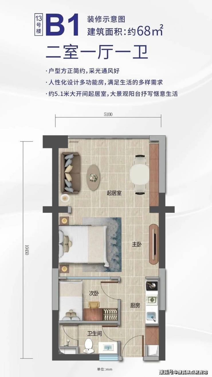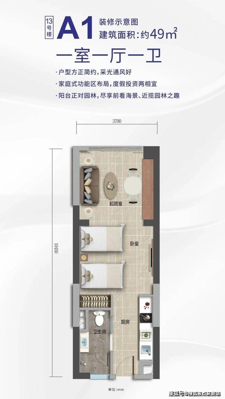 产品面积:约40㎡-89㎡(单房-两房)