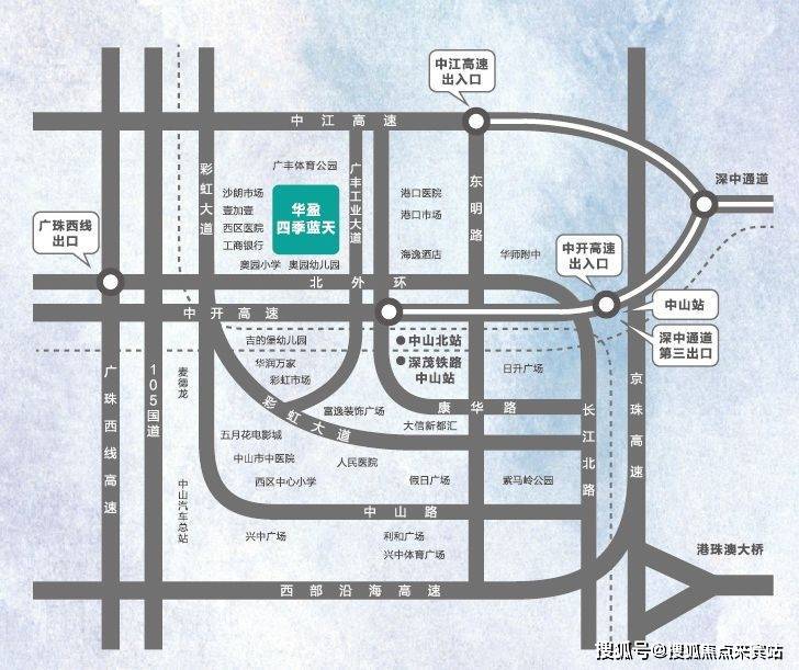 华盈·四季蓝天项目地处西区彩虹片区,享12万㎡城熟配套,东南方向1.5公里处为广珠城轨中山北站;揽括主城西、北区生活配套,构成中山未来核心居住区(江北新区CLD)的发展重点。