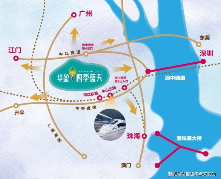 中山华盈·四季蓝天项目东面就是深中通道始发站高速口,走深罗高速直驳深中通道,半小时到深圳,走中江高速上广珠西线,往北广州往南珠海,都在40分钟内。到2019年还可以走中开高速去开平茂名。项目离中山城轨北站仅5分钟(深中通道从第三出口驶出,通过中江高速港口出口下高速,车程约5分钟到项目),坐广珠轻轨去珠海和广州都非常便捷,港珠澳大桥直达香港澳门。