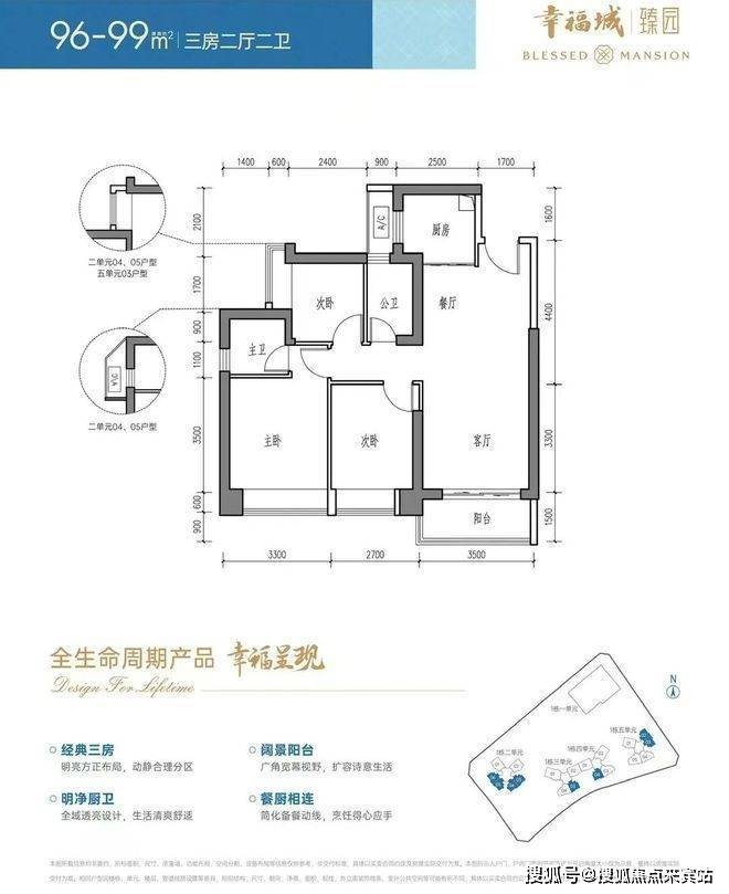 96-99㎡三房两厅两卫(竖厅):约300套,占比35%