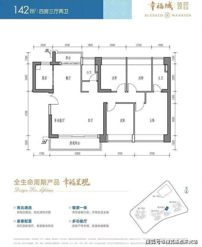 横厅南北通透格局,客厅出5.9米长的观景大阳台,U型厨房,得房率约87.1%。