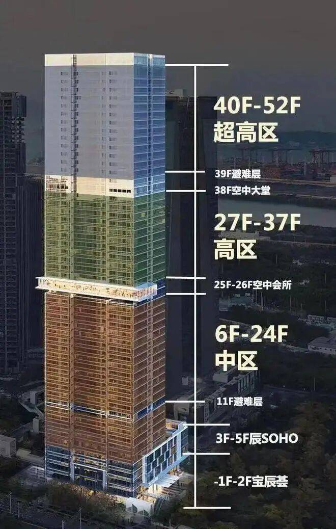 华侨城宝辰总高230米,为宝中最高楼;项目52层,分为中区、高区、超高区,6层起卖,11、39F为避难层,25-26F为空中会所,28F为空中大堂。除了空中大堂项目还有地下入库大堂+首层大堂,一共三重大堂。