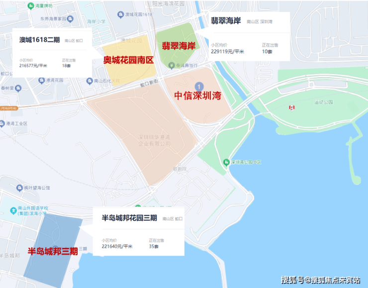 从价格来看,距离中信深圳湾目最近的小区:翡翠海岸、半岛城邦花园三期、奥城花园南区等二手房挂牌价均在22万/㎡左右,甚至巅峰期价格一度到达30万+/㎡。