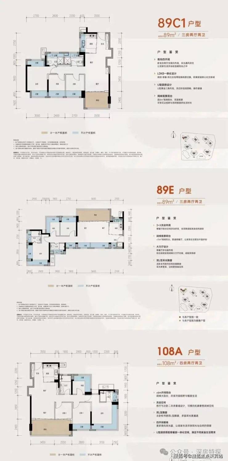 项目主打高使用率新规全周期户型,得房率最高超100%,空间实用无浪费,主力面积涵盖84-89㎡三房、108㎡四房,全系户型方正通透,多开间朝南,搭配宽景阳台与多赠送飘窗,采光通风俱佳。84-89㎡三房适配刚需小家庭、年轻白领,108㎡四房空间阔绰,完美满足多孩家庭、三代同堂居住,功能分区合理,日常居住舒适度拉满。