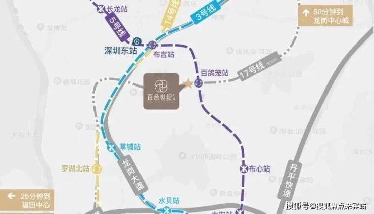 项目紧邻地铁5号线百鸽笼站(步行约100米),且未来规划有17号线罗岗站约450米在此交汇,形成双地铁上盖优势,通过地铁5号线,1站可换乘3/14号线,4站直达福田核心区,7站快速通达深圳北站,高效串联南山、前海等区域。